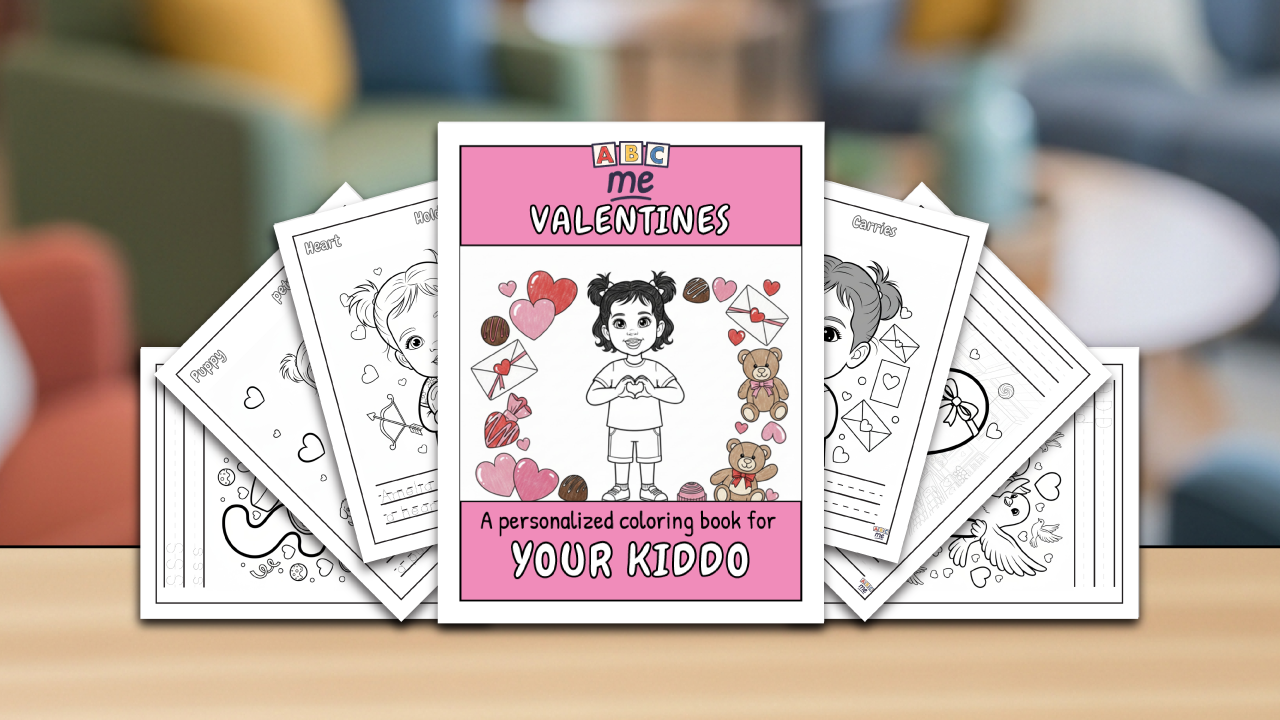 ABCme’s Valentines topic turns hearts, cards, puppies and sweet surprises into a custom coloring book and personalized ABC book created to support early learning.